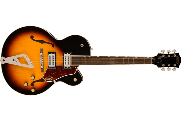The G2420 Streamliner Hollow Body Single-Cut with Chromatic II tailpiece features a fully hollow arched maple body with parallel tone bars for rich fullness, deep resonance and "big-body sound."